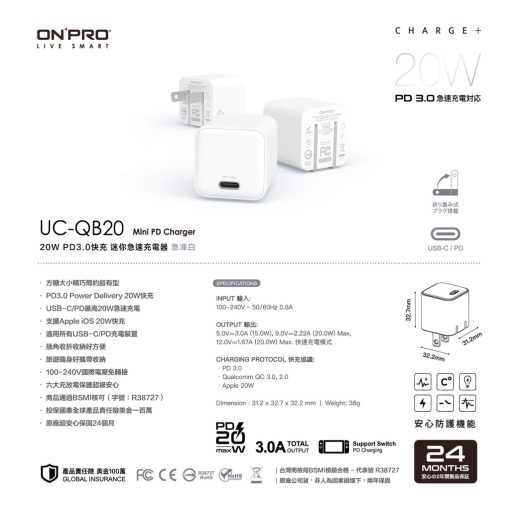 12.0V⎓1.67A (20.0W) Max. 快速充電模式